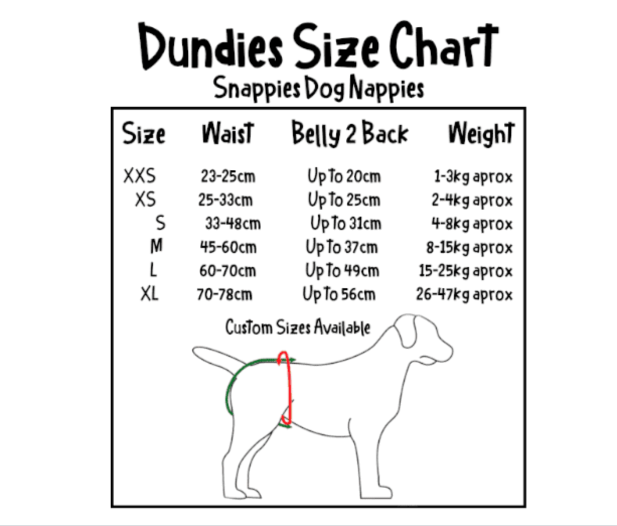 Dundies® is an Aussie made, tried and tested product with all of our patterns and shapes uniquely design and drawn in house! Dundies® Snappies are a world first in snap and wipe dog nappy technology giving you effortless cleaning and washing and amazing financial savings! Our Dundies® are made from only the highest quality medical grade fabrics, with our external shell made from light chew and scratch resistant breathable fabric with anti fade colour. Dundies® are designed for pets and crafted for owners, whether it’s the soft and secure elastics, easy fit velcro, fast dry fabrics or unique comfort tail slit, our Dundies® cover it all, not just bums!